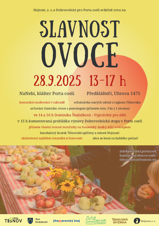 Zveme Vás na Slavnost ovoce, která se uskuteční dne 28. 9. 2025 od 13 do 17 hod. v obci Předklášteří. Těšit se můžete mj. na komunitní moštování, ochutnávku starých odrůd z Tišnovska a určování vlastního ovoce s pomologem. Slavnost pořádaná organizací Hojnost, z.s., která je jedním z partnerů Září – Měsíce biopotravin a ekologického zemědělství, podporuje myšlenku ekologického hospodaření v kraji a obnovu tradičních sadů. Více informací o Slavnosti ovoce naleznete zde a na Facebooku.